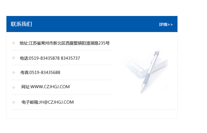 地址:常州市新北區友邦商務大廈1幢16、17層  電話:0519-85101652  傳真:0519-85112595  郵編:213022  網址:www.cz-jiayue_cn.sumhoo.com  郵箱:xiajifengaa@163.com